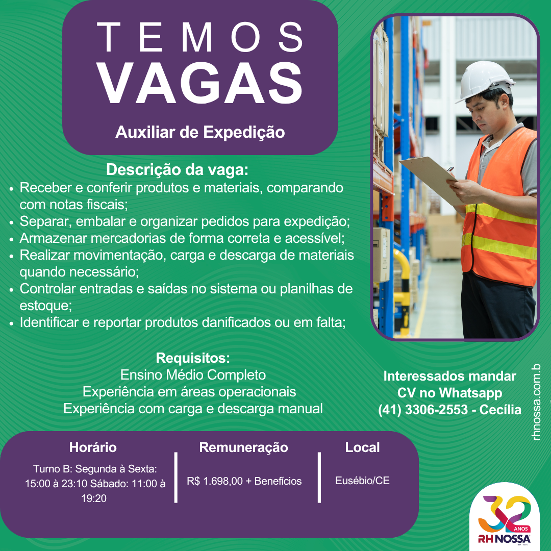 Mandar seu currículo com o nome “Auxiliar de expedição – Eusébio” para o número 41 3306-2553 (Cecília)