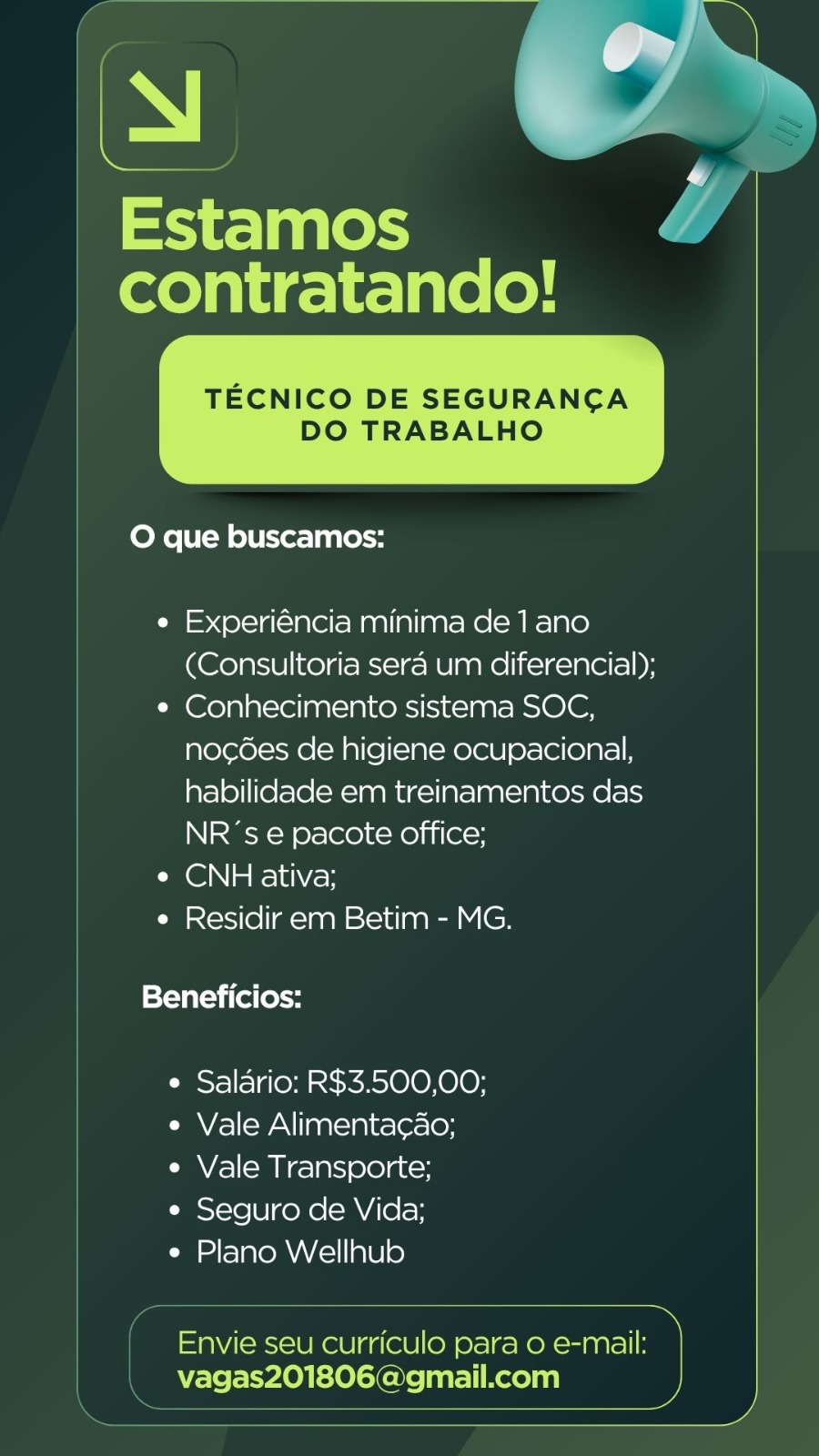 Buscamos um Técnico de Segurança do Trabalho comprometido, responsável e proativo para integrar nossa equipe.